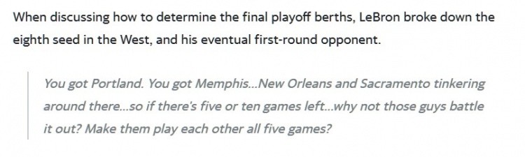 不过《NBC体育》则晒出了上赛季的暂停期间,也就是当地时间2020年3月27日,詹姆斯在参加节目《Road Trippin》播客节目时所说的一番话。这番话与今日的言论相悖,那时詹姆斯表示:“联盟现在有开拓者、有孟菲斯、有新奥尔良以及萨克拉门托纠缠在一起(意思是指的球队的排名),所以,如果还有5场或者10场常规赛的话,为什么不能让这些球队去争夺呢?直接让他们对阵五场!”